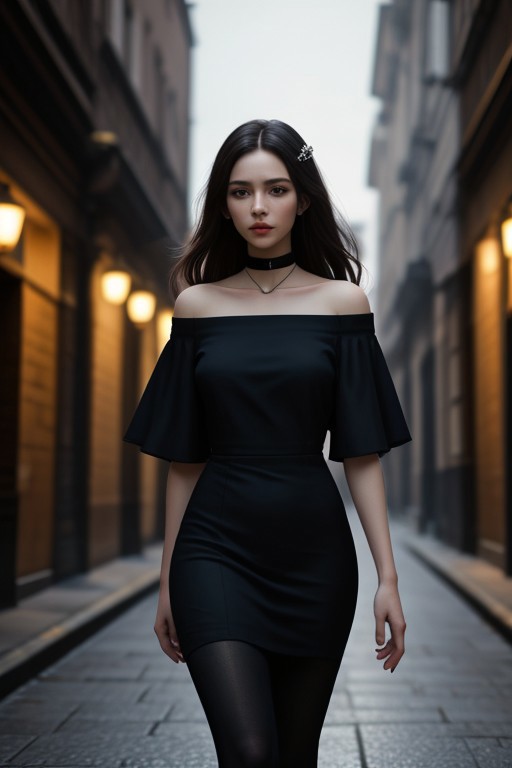 3d, 1girl, black dress, off-shoulder dress, thigh-high stockings, long hair, brown hair, hair ornament, choker, necklace, shy expression, looking down, dynamic lighting, highres, masterpiece, best quality, photorealistic, ultra detailed, hyper detailed, walkway, evening, city lights, cinematic, ethereal, flowing hair, detailed fabric, elaborate environment, magical atmosphere, soft focus