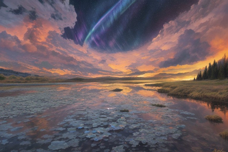 On Aurora Plains, iridescent skies danced with colors that harmonized in a celestial symphony every evening always, painting the night sky with hues of gold and crimson.