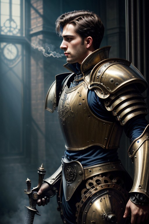 masterpiece, best quality, absurdres, illustration, photorealistic, cinematic, dynamic angle, perfect composition, 1boy, steampunk, armor, brass armor, gears and cogs, steam-powered limbs, mechanical sword, Victorian knight, glowing gauges