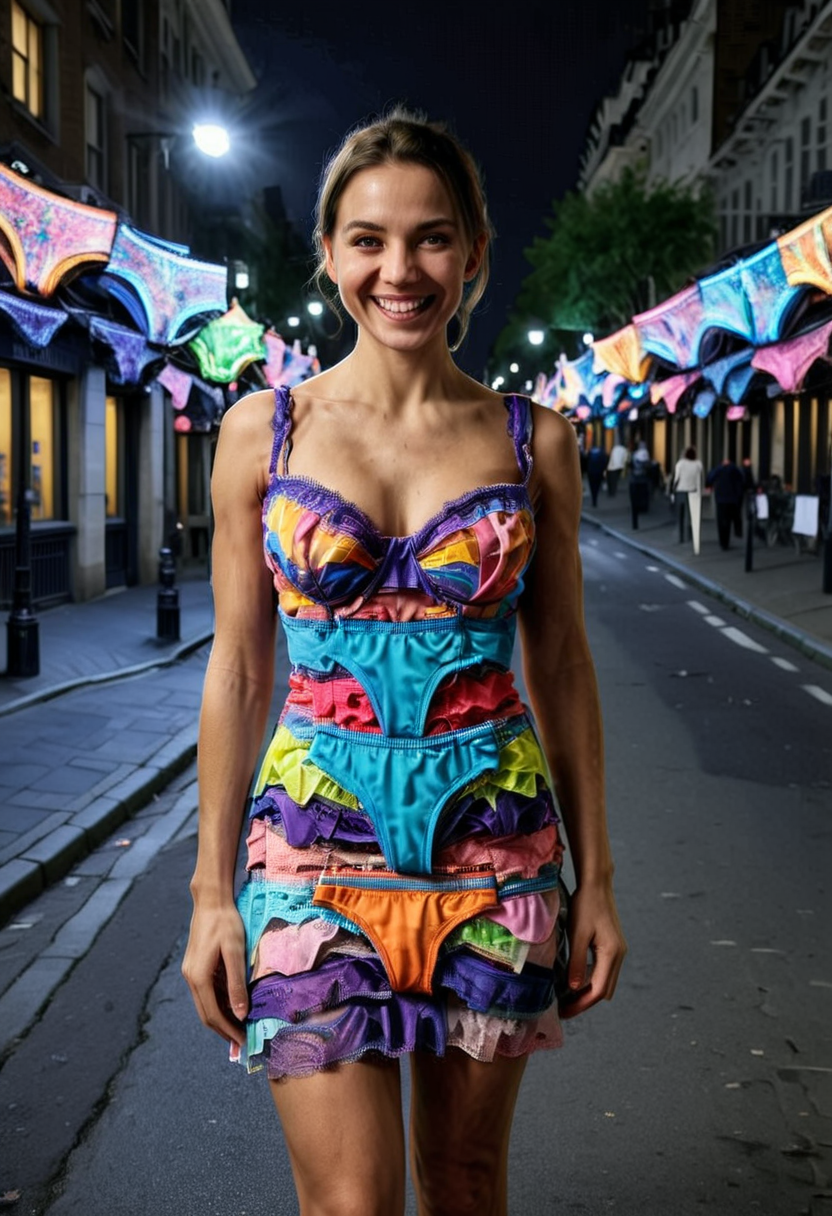 award winning, P4NT13S, a woman wearing a colorful dress P4NT13S, woman smiling, set in the street at night, city, ,enhanced textures, creative, beautiful, vibrant, masterpiece, 8k, Ultra HD, amazing details, amazing quality, amazing artist, sharp edges, detailed textures, full view, atmospheric lighting, amazing visuals