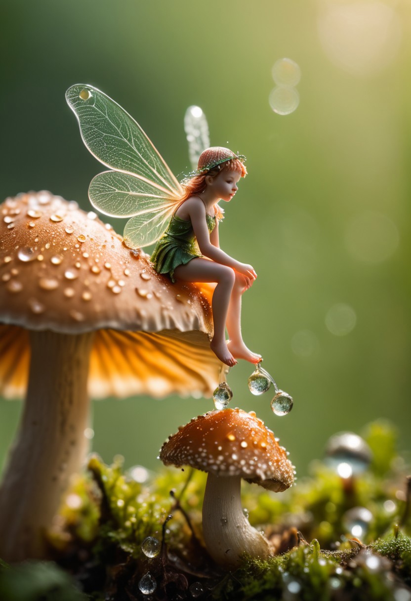 Macro photography of a tiny fairy sitting on a mushroom. Dew drops reflect the morning light.