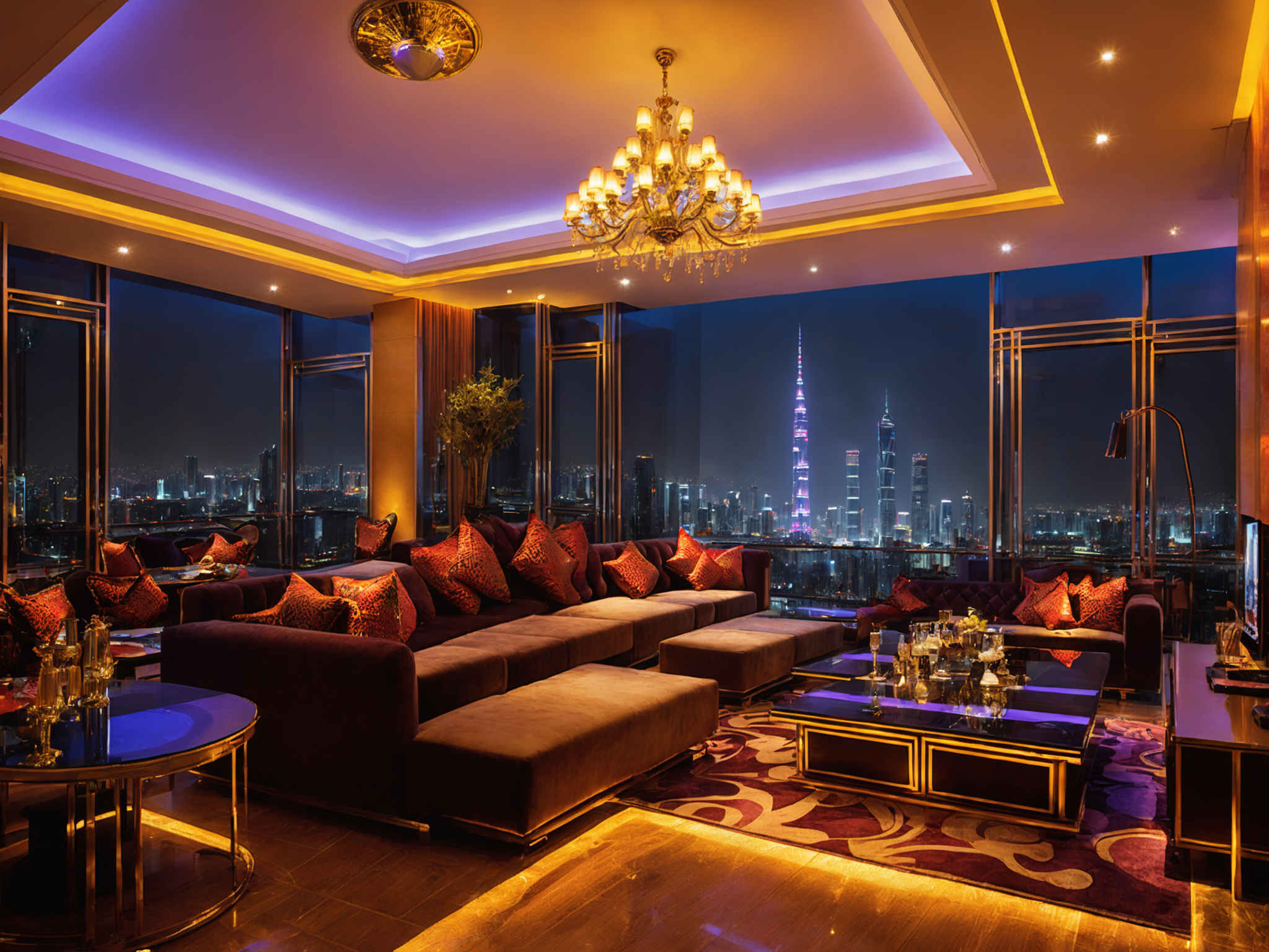 ktv,<lora:ktv_XL:0.6>,indoors,table,couch,lamp,candlestand,cup,food,towering skyscraper top floor space,large floor-to-ceiling windows,with a view overlooking the city's night view., An atmosphere that is high-end and atmospheric,combining the prosperity of the city with the tranquility of the starlit night., A style of modern urban,combining a sense of luxury with a sense of fashion., The background of the city skyline at night,the flickering neon lights,and the outline of distant high-rise buildings., Indoor lighting complements the city's night view,using indirect lighting and dimming techniques to create atmosphere.,