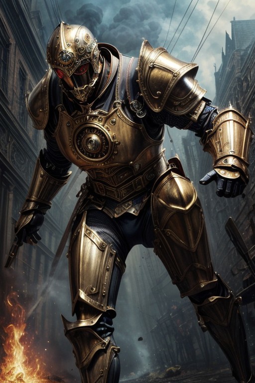 masterpiece, best quality, absurdres, illustration, photorealistic, cinematic, dynamic angle, perfect composition, 1boy, steampunk, armor, clockwork design, metallic limbs, brass armor, steam-powered core, Victorian military, intricate machinery