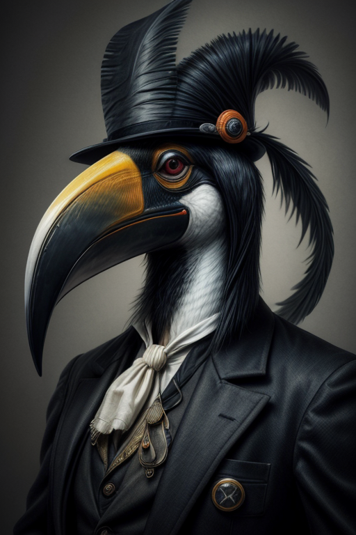 award winning digital art, side portrait of sophisticated toucan wearing a suit and a high hat and a monocle, victorian style, masterpiece, extremely detailed, 32 <lora:ip-adapter-faceid-plusv2_sd15_lora:0.65> <lora:Hyper-SD15-8steps-lora:0.5> <lora:sd_v15_dpo_lora_v1:0.3> <lora:more_details:0.6>