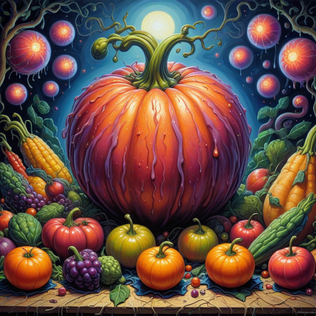 <lora:TrippyStyleSDXL:1>tr1ppystyle Surrealist oil painting, giant fruit and vegetables, twilight atmosphere, lost souls, twinkling lights, glowing orbs, vibrant colors, textured canvas, impressionistic brushstrokes, dramatic shadows, chiaroscuro, moody, whimsical, fantasy, dreamlike, ethereal, magical, otherworldly, detailed, intricate, surreal, imaginative, evocative, inspiring, thought-provoking, captivating, enchanting, awe-inspiring, breathtaking, visually stunning, high-resolution, fine art, masterpiece, signed and dated, limited edition, certificate of authenticity, archival quality, durable, long-lasting, timeless, heirloom quality