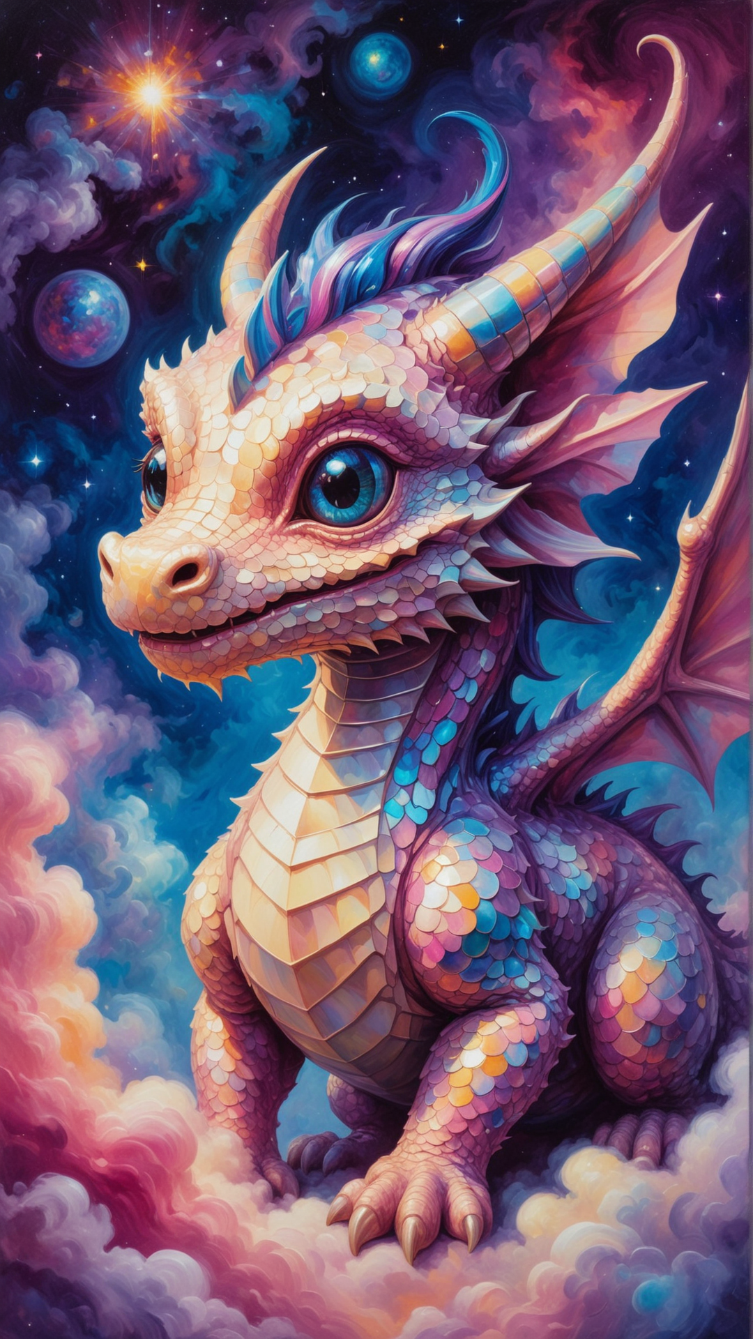 <lora:DiscoBallStyleSDXL:0.6> DiscoBallStyle Cream A vibrant and colorful abstract painting of a baby dragon soaring among clouds of interstellar gases, with hues of blues, purples, and pinks swirling together in the background, creating a mesmerizing and whimsical scene, oil paint texture, acrylic paint texture, canvas texture, thick brush strokes, impressionist style
