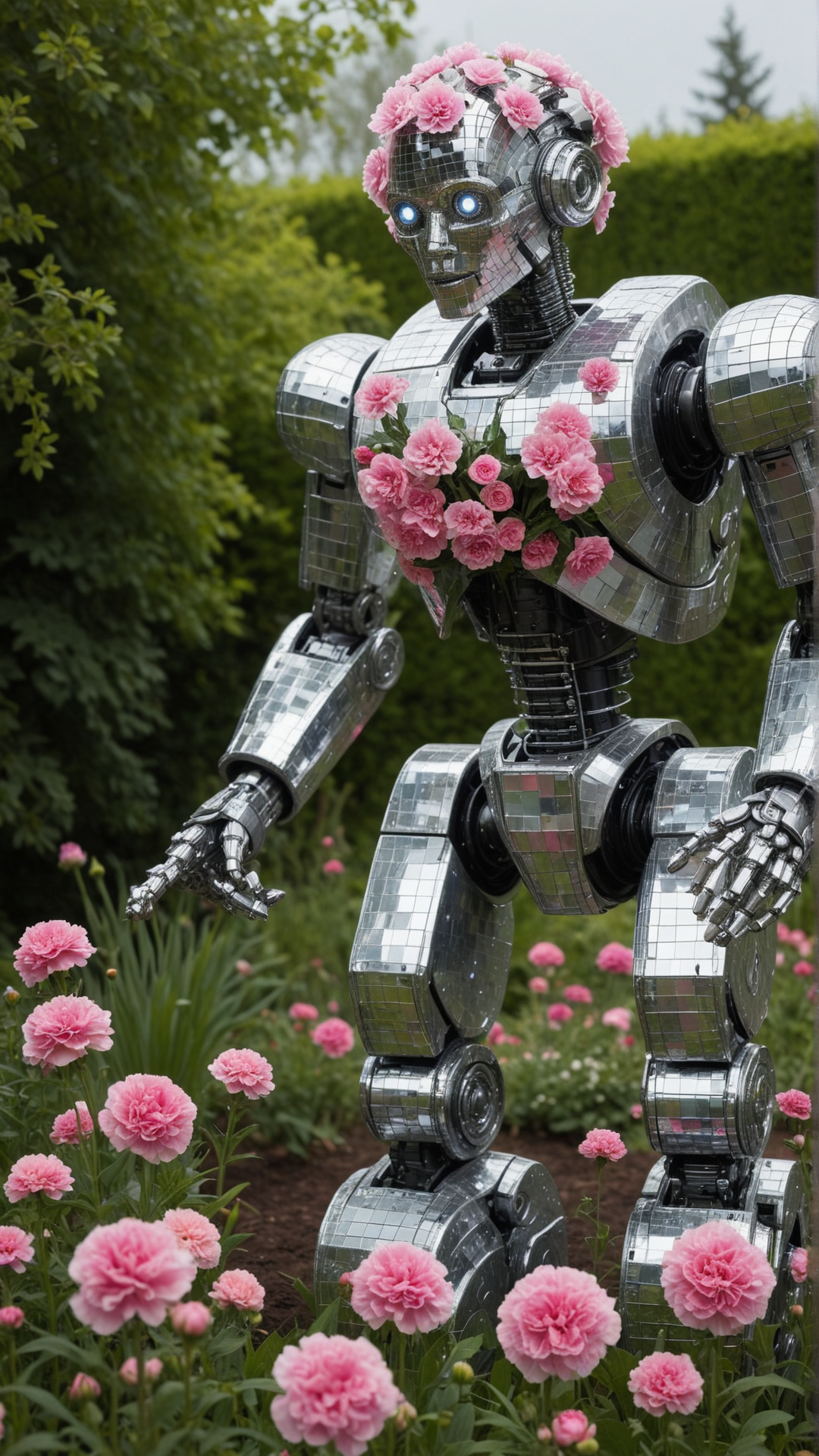 <lora:DiscoBallStyleSDXL:0.6> DiscoBallStyle Carnation a robot tending to a garden of electronic flowers