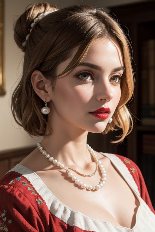 Portrait of Ximena Leon casually standing: solo, 1girl, age:47, middle-aged, height 5'7", 130 lbs, medium chested, fair skin, diamond face, short hair, blonde hair, french braids, hair bun, brown eyes, arched eyebrows, upturned nose, thin lips, red lipstick, pearl necklace, pearl earrings, embroidered blouse, dreamy, naïve, indoors, living room, stone walls, (close-up:1.4), realistic, masterpiece, correct anatomy, sharp focus, field of view