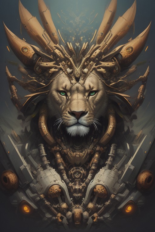 Portrait of a Biomechanical lion robot :: hyperdetailed and intricate matte painting by Jean Baptiste Monge, Jesper Ejsing, Anton Fadeev, Peter Mohrbacher :: hypermaximalist, precisionism, 16k :: blues, greens, yellows :: a masterpiece, trending zavy-cnmtc zavy-rmlght low-key