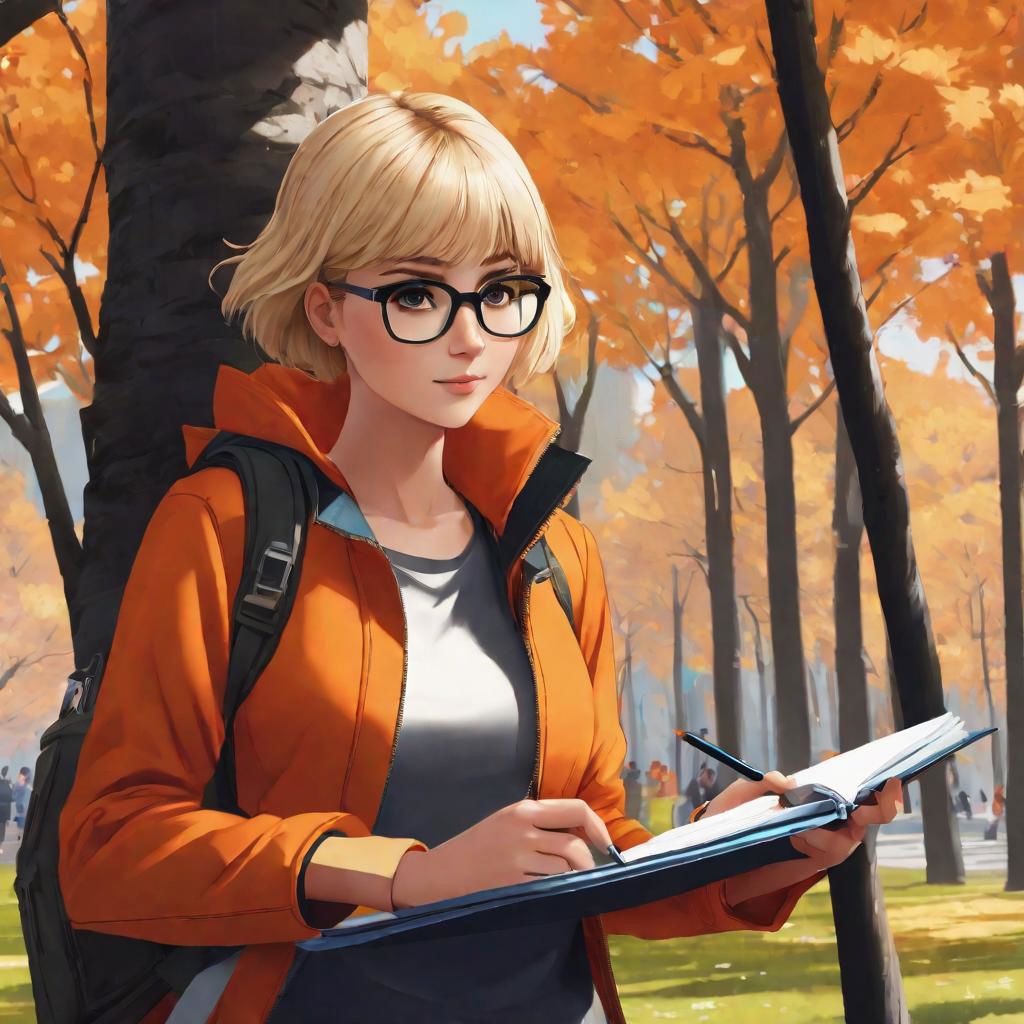a girl with short blonde hair, wearing a orange jacket, wearing big glasses with no lenses, have a utility belt, she is writing on her notebook as she on top of a tree spying on people in a park.