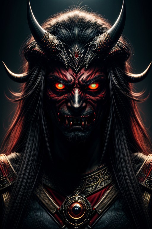 masterpiece, best quality, absurdres, illustration, photorealistic, cinematic, dynamic angle, perfect composition, 1other, oni mask, fearsome expression, glowing eyes, sharp fangs, intricate horns, red and black hues, intimidating aura