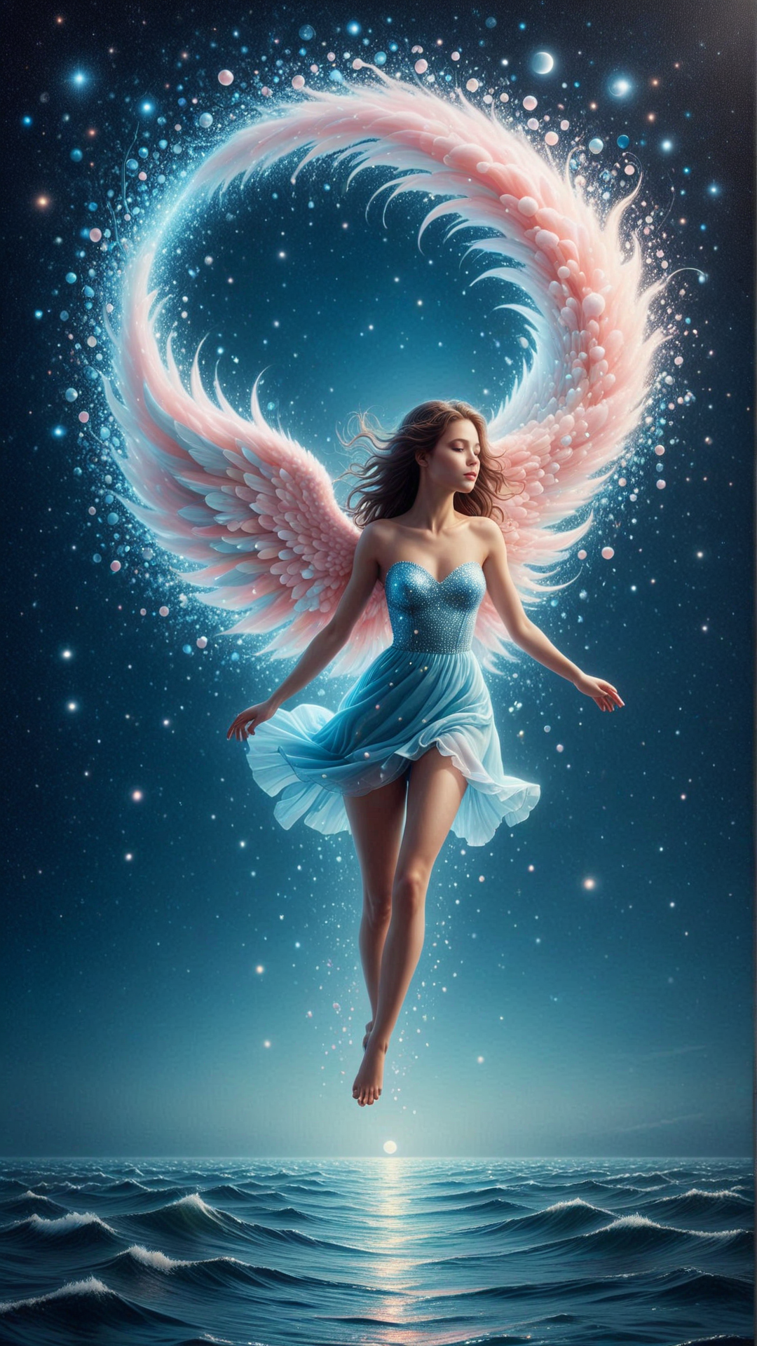 <lora:DiscoBallStyleSDXL:0.8><lora:CottonCandyStyleSDXL:0.7> Sky blue and Blush DiscoBallStyle, CottonCandyStyle Moonlight shimmering on a calm, peaceful ocean, intricate patterns of light and shadow, playful and mischievous fairies dancing and weaving among the waves, soft, glowing wings, joyful expressions, twinkling laughter, silvery reflections, cool colors, glistening water droplets, enchanting atmosphere, subtle, glowing auras, twilight background, full moon, starry night sky, dreamlike quality, oil painting, highly detailed, rich colors, soft focus, illustration, concept art, fine art, epic, ethereal, magical