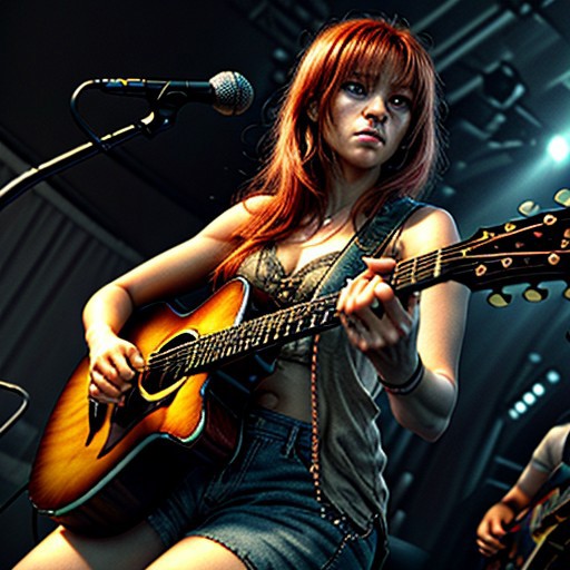 Hyper-realistic, 16k resolution, intricate details. (masterpiece, award winning artwork) many details, extreme detailed, full of details, Wide range of colors, high Dynamic OverallDetailXL <lora:add-detail-xl:0.95> <lora:WildcardX-XL-Detail-Enhancer:0.9> <lora:xl_more_art-full_v1:0.2> BREAK 1girl, red hair, playing guitar, microphone triadic colors, stunning, epic, intense, highly detailed, warm light, imposing, confident, beautiful composition, cool colors, ambient background, deep rich colors, playing guitar, guitar,