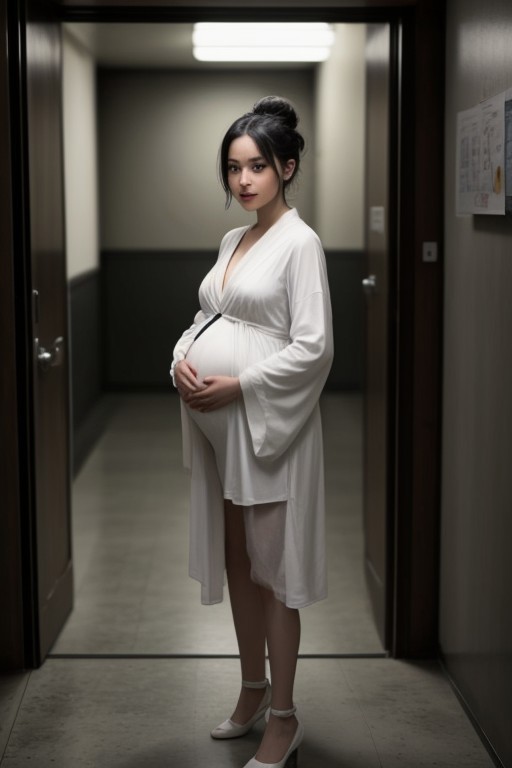 There is a door at the end of a dark and narrow corridor that can only accommodate one person. Standing in front of the door is a smiling white zombie pregnant woman with black hair in a bun, no bangs on her forehead, no hair below her neck, and a white robe. , black high-heeled shoes, covered with dirt (including body and clothing), because she blocked the only exit, so we were trapped here and unable to escape. FHD, rich in detail, masterpiece, realistic style, canon 5D4.