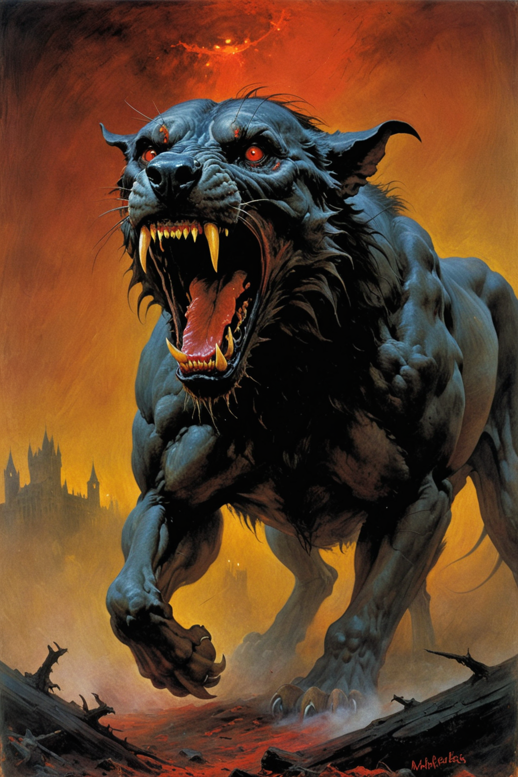 best quality, masterpiece, absurdes, A haunting portrait of the Hound of the Baskervilles, the legendary beast from the moors. The hound, with its massive, muscular build, stands in a threatening pose, its fur bristling and eyes glowing with an eerie, supernatural light. Its sharp fangs are bared in a menacing snarl, saliva dripping from its jaws. The background is a mist-covered moor under a full red moon, casting long shadows and creating an atmosphere of suspense and terror. The style is a mix of realism and gothic horror, capturing both the physical presence and the chilling aura of the beast.renaissance, impressionism, solo <lora:Kodak Motion Picture Film Style v4:0.4> <lora:DnD_Grainyboyz V2 SDXL Lora:0.5> DnD_Grainyboyz <lora:Stephen Gammell Style:0.3> Stephen Gammell Style <lora:sdxl_lora_beksinski:0.3> digital artwork by Beksinski