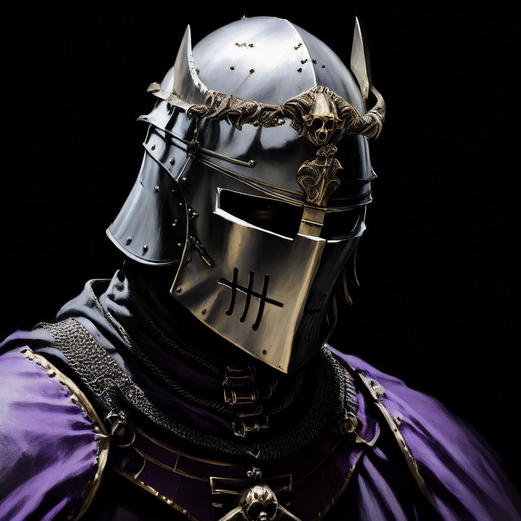 score_9, score_8_up, <lora:dark_fantasy-000013:1>, portrait, top half, character art, dynamic angle, dark fantasy artstyle, cinematic lighting, imperfections, portrait 1 man, human, pale gray skin, human eyes, hazel eyes, solo, angular face, emotionless expression, looking to the side, strong, dark knight, (lilac surcoat, full-plate armor), (full helmet), (skull-shaped helmet visor), ((visor up)), inside the dark study, dim lighting,