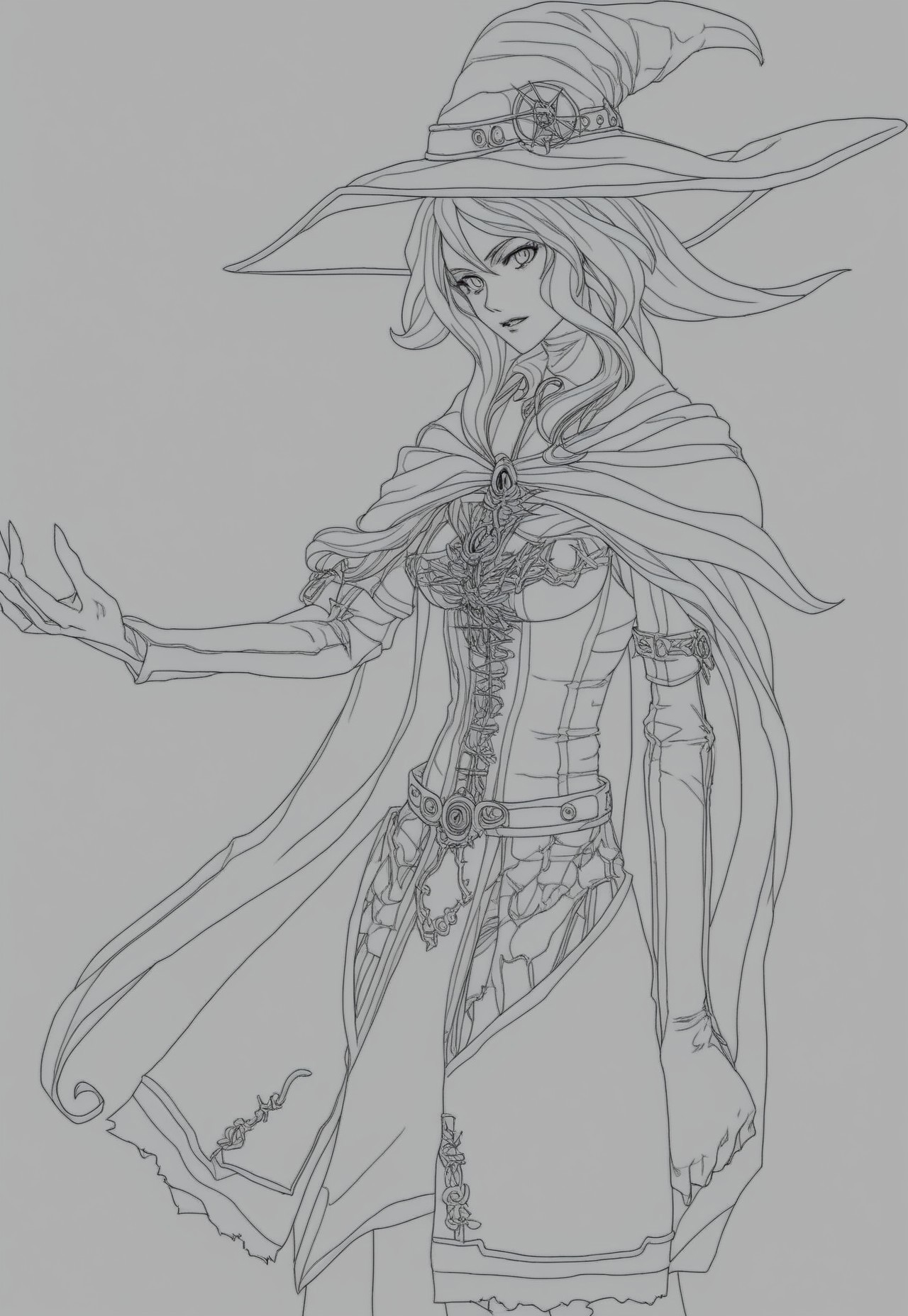 lineart, 1girl, bohemian witch, cottagecore, (simple background)