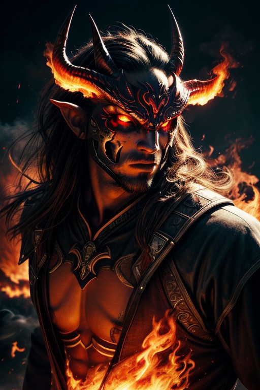 masterpiece, best quality, absurdres, illustration, photorealistic, cinematic, dynamic angle, perfect composition, 1other, oni mask, fiery eyes, burning horns, smoke trails, glowing embers, intense heat, flaming background