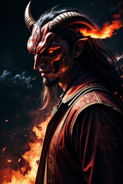 masterpiece, best quality, absurdres, illustration, photorealistic, cinematic, dynamic angle, perfect composition, 1other, oni mask, fiery eyes, burning horns, smoke trails, glowing embers, intense heat, flaming background