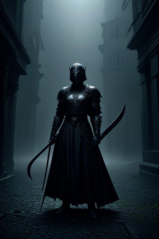 The image portrays a terrifying gothic scene, featuring a haunted, gothic-style female warrior in a shadowy, decaying setting. The subject is clad in a macabre, ancient armored suit with twisted, dark iron accents and sinister, blood-red patterns. Her helmet, a grotesque and angular piece, partially covers her face, casting an eerie, foreboding shadow. The armor is adorned with haunting symbols and runes, with grim, silvery inscriptions on the sleeves and sash that seem to writhe and move. The warrior wields a cursed, ethereally glowing scythe, its hilt embedded with sinister, pulsating stones, strapped to her side. The overall aesthetic is both dread-inducing and formidable. The background reveals a crumbling palace courtyard, its once-grand arches now twisted and malformed, with grim mosaic walls reflecting a cold, ghostly light. A dense, black smoke swirls ominously around the warrior, enveloping her in a shroud of darkness.