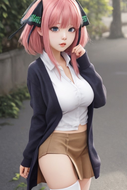 anime girl, japanese School uniforme, very Big tits, sexy pose, pink hair, black short skirt, white thigh high socks, nakano nino, butterfly hair ornament, black cardigan