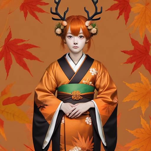 girl wearing a kimono made of orange and brown leaves, have orange hair and her antlers are bare, full body
