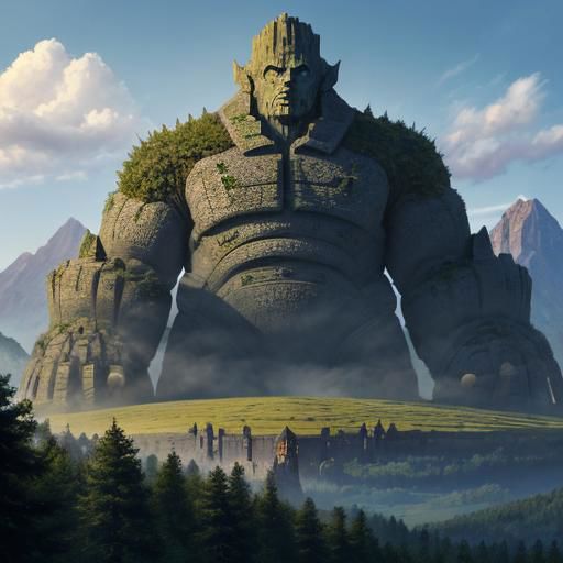 a thousand feet tall and resembles a truly mountainous golem made entirely of earth with mountain-like spires on his.
