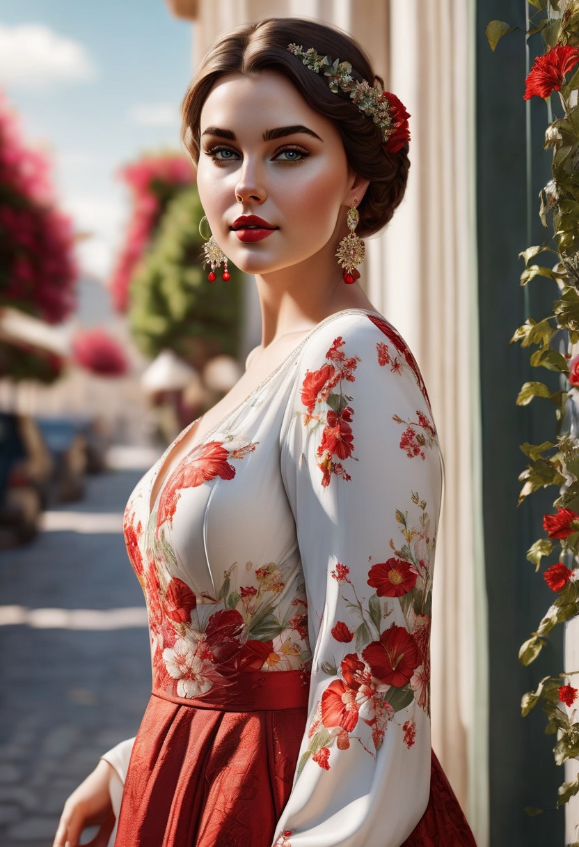 Perfect photorealistic (close portrait:1.5) image of a very cute (curvy chubby:1.1) brunette woman, (side view), she is 21 years old, (short chignon hairstyle:1.2), wearing a (white long long sleeve flowing dress with a vibrant red floral pattern and a (straight neckline:1.5):1.3), (squezzed medium sized torpedo tits:1.3), small hoop earrings, standing in front of a big delivery entrance, (it's a sunny Day:1.5), detailed, (seductive smile:1.1)
