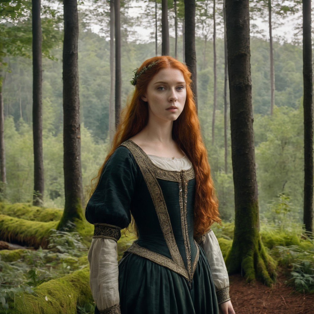 young gorgeous girl from a German medieval ballad, long red hair, renaissance painting, lush forest in the background, full height, perfect eyes, best quality, masterpiece