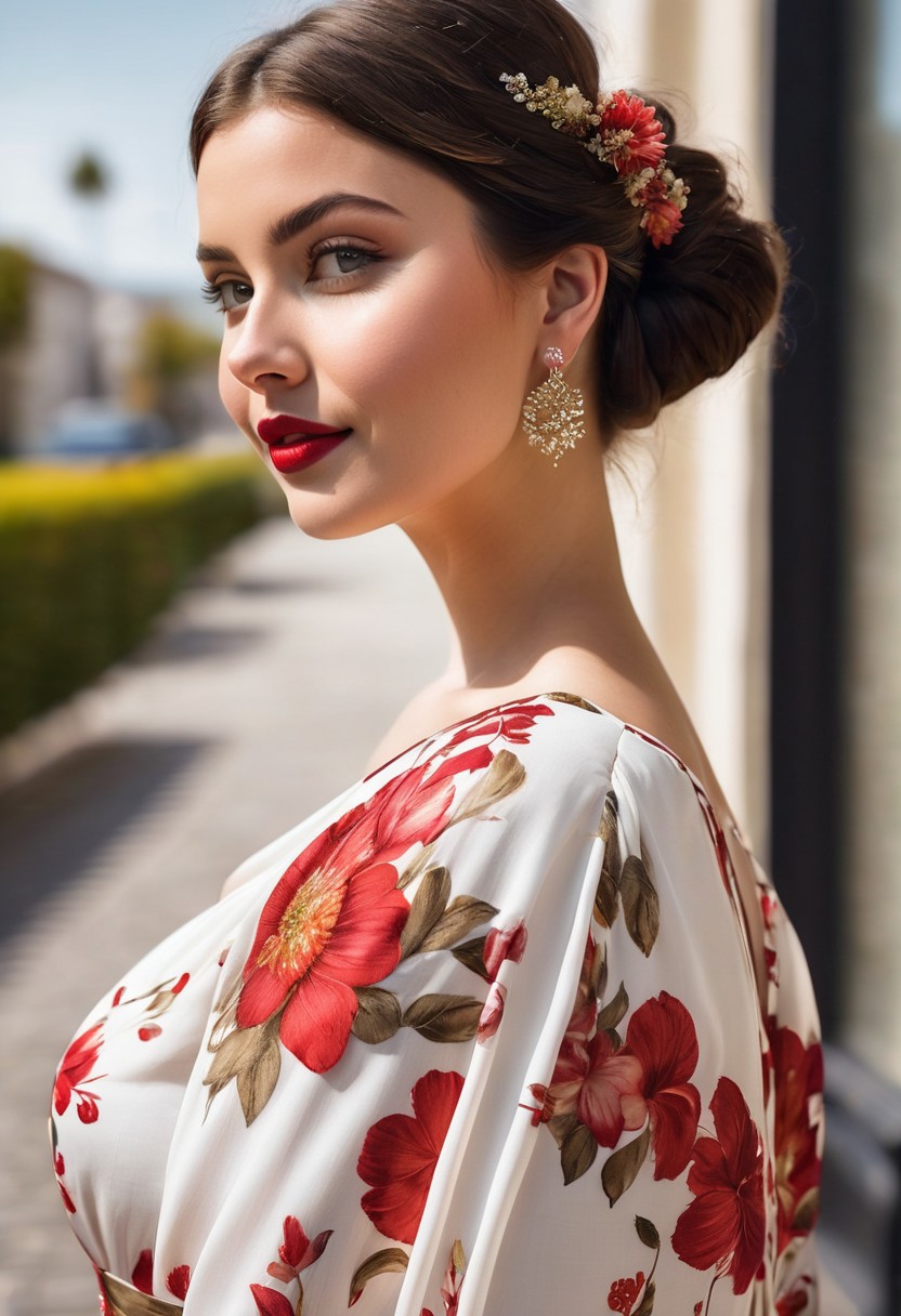 Perfect photorealistic (close portrait:1.5) image of a very cute (curvy chubby:1.1) brunette woman, (side view), she is 21 years old, (short chignon hairstyle:1.2), wearing a (white long long sleeve flowing dress with a vibrant red floral pattern and a (straight neckline:1.5):1.3), (squezzed medium sized torpedo tits:1.3), small hoop earrings, standing in front of a big delivery entrance, (it's a sunny Day:1.5), detailed, (seductive smile:1.1)