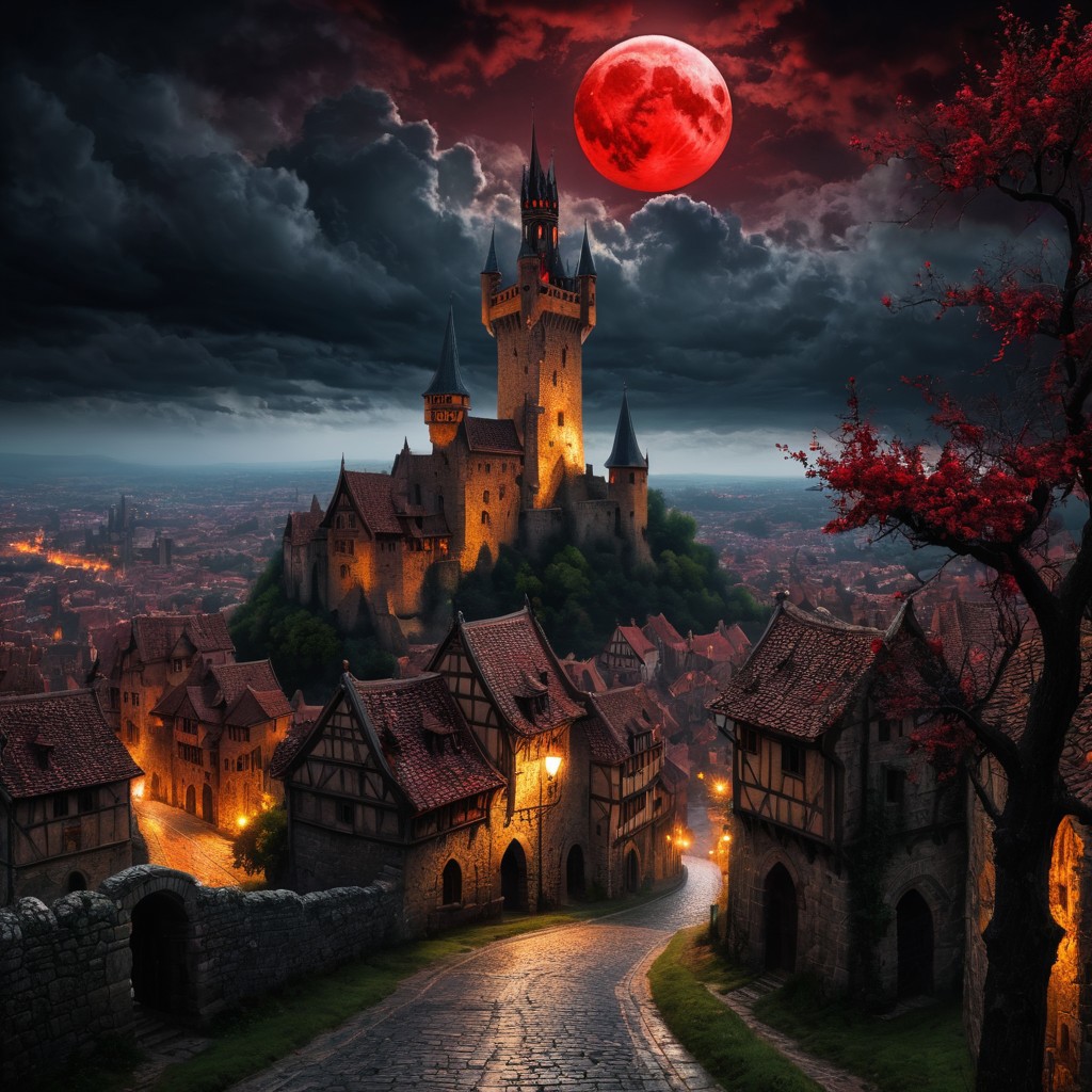 outdoors, sky, clouds, tree, no humans, cloudy sky, building, scenery, city, fantasy, old medieval road, cityscape, old medieval tower, intricate and detailed, dark tower, heavy dark clouds, bloody sky, red full moon