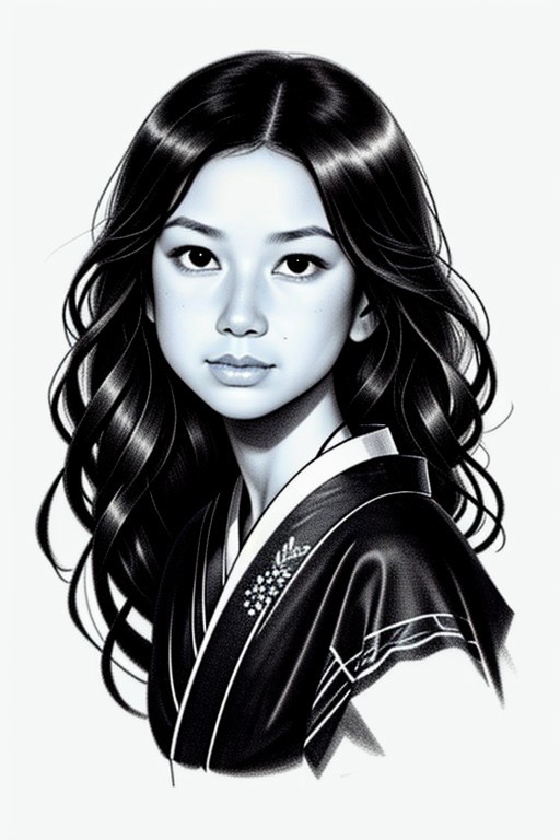 1girl, face focus, dark hair, upper body, looking at viewer, black silk kimono, cartoon, line art, sketch