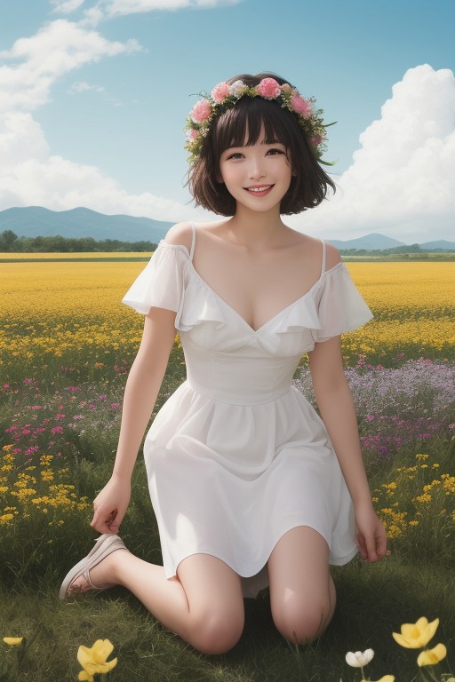 score_9, score_8_up, score_7_up, detailed landscape, 1girl, white dress, kneeling on the floor, flower field, blue sky, clouds, sunny, flower crown, black hair, bangs, hair with wind, looking at viewer, smiling, blush,
