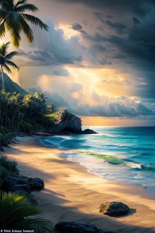 extremely detailed, Sandy beach of the Caribbean Sea with isolated rocks and palm trees on the shore. Waves lazily roll onto the shore. Clouds of an approaching storm darken on the horizon