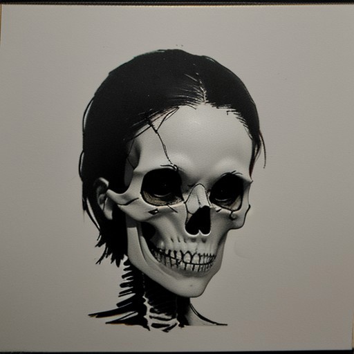 Close-up portrait of a female skeleton with a dark background, rendered in the style of a charcoal painting. Incorporate a supernatural and scary mood, enhanced with a touch of eerie smoke swirling around. Emphasize the Chiaroscuro lighting to create dramatic contrasts between light and shadow, and add linocut textures for depth. Apply a tilt-shift effect to focus attention on the details of the skull and facial features.