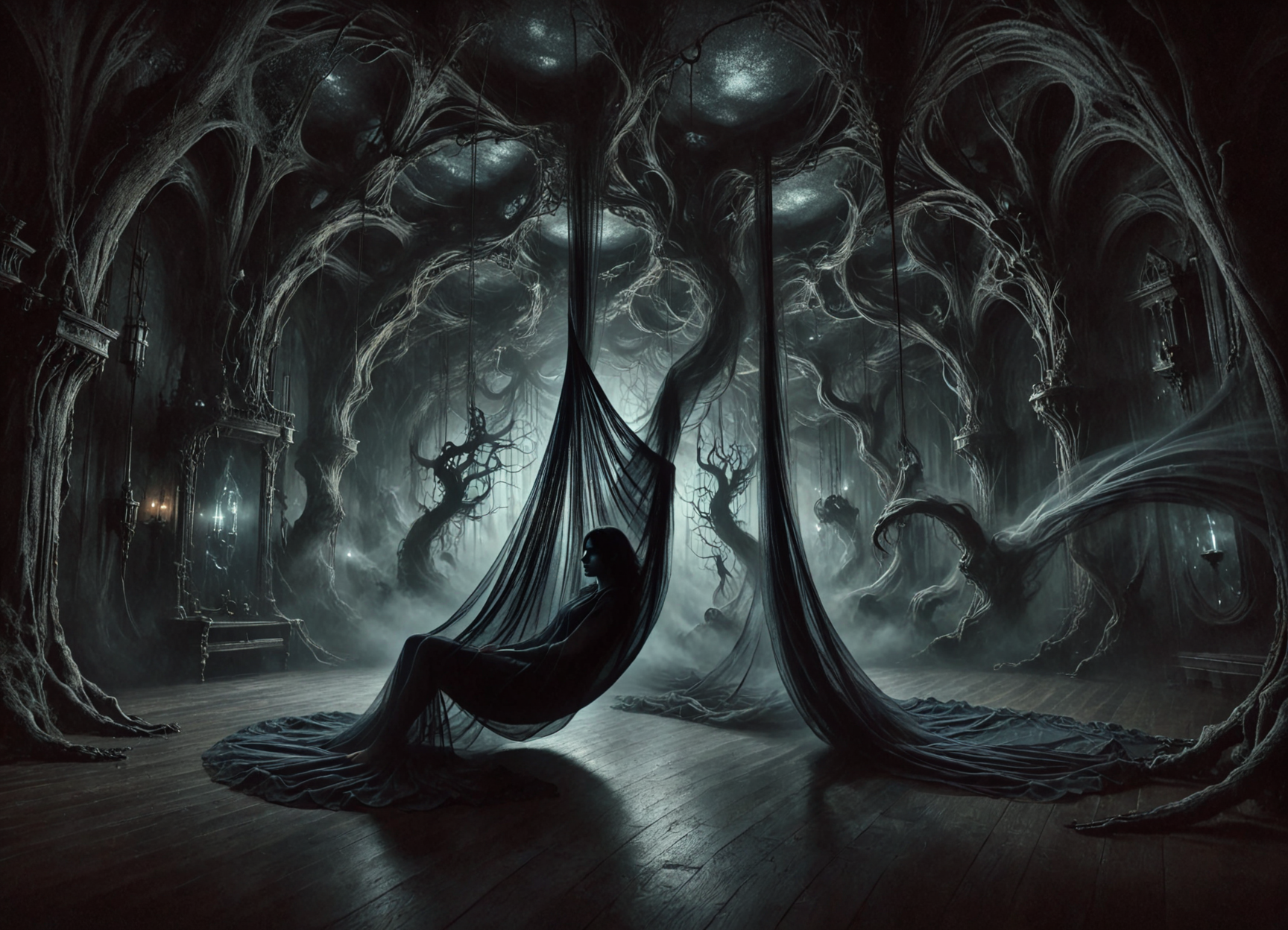 DonMV31l0fD4rkn355XL magic academy, murmur of subconscious dreamwalking chamber, suspended hammocks,lucid loungers, dream diaries,nightmare catchers, dream projectors,sleep pattern monitors,mind mappers, subconscious navigators, , , magical, fantasy <lora:DonMV31l0fD4rkn355XL:1>