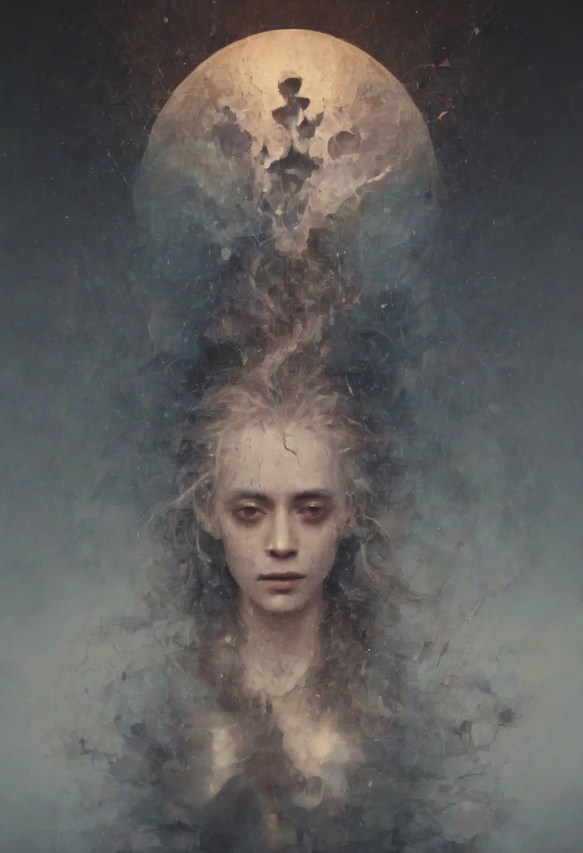 Under a cascading rainfall, delicate drops touching strands of hair and creating silhouettes on the body, various phases of the moon adorning the skin like ephemeral tattoos, a 38 years old man , watercolor style, highlighted by moody, cool tones, rain droplets catch ethereal glow, reflections of lunar phases
