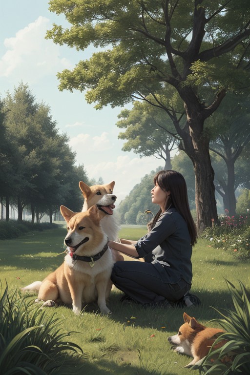 line art drawing . professional, sleek, modern, minimalist, graphic, line art, sitting, closed_mouth, outdoors, day, tree, group of corgis playing, leaf, watermark, grass, instrument, nature, forest, foliage