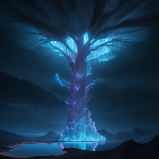 masterpiece, 8k, extremely high detailed, volumetric lightning, alien landscape, crystal trees, xenon lakes, fluorescent mountains, translucent alien animals