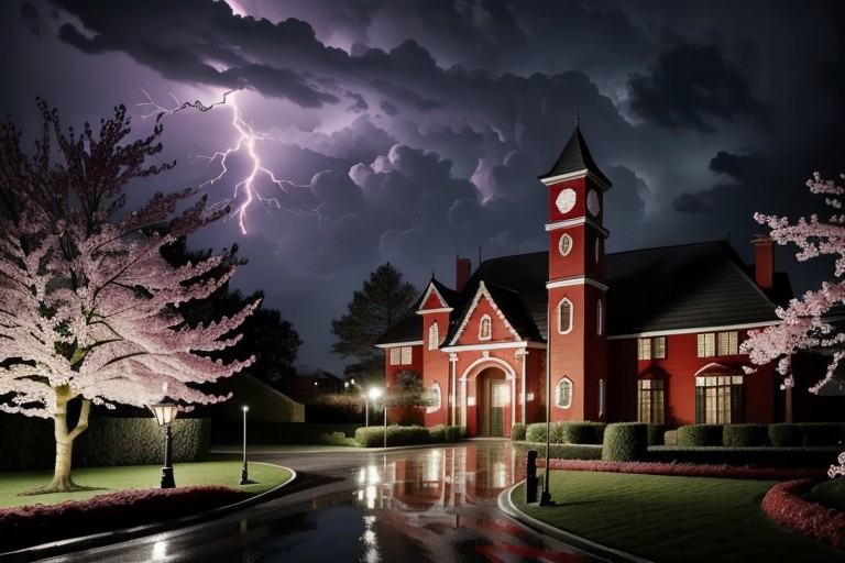 ((best quality, masterpiece, ultra detailed, sharp focus, 8k, detailed eyes, detailed face, picture-perfect face, flawless, clean, perfect face, perfect anatomy)), red mansion, clock tower, red walls, black roof, rose bushes, hedges, shrine gate in front, stormy weather, rain, blood moon, night time, ominous lighting, darkness, low light, lightning strike in the background, cherry blossoms,