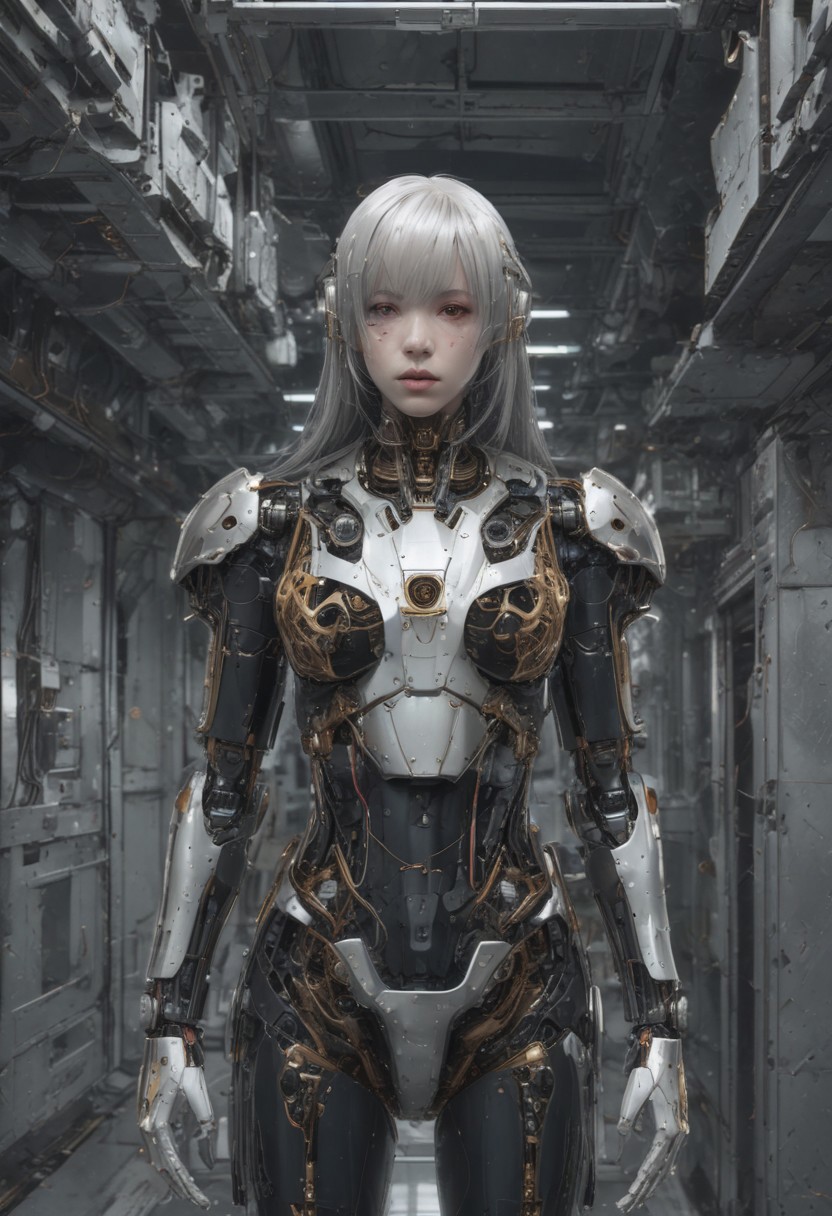 NijiEX style, robotic girl, artificial breasts made with metal, breasts, ripped clothes, long hair, gold and black skin, diagonal composition, sad expression, whole upper body, (best quality, masterpiece, high resolution:1.4), high_quality, 1girl