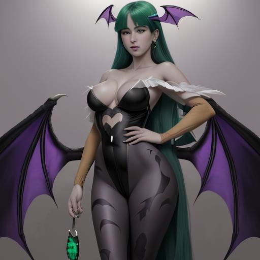 Morrigan Aensland generalmente viste un traje de bao oscuro con adornos verdes. Su atuendo es revelador, mostrando su fsico, y est diseado con un estilo que resalta su aspecto sobrenatural y seductor. El traje de Morrigan consiste en un body de una pieza color oscuro, ajustado al cuerpo, que revela sus piernas, brazos y parte del torso. Tiene detalles verdes que contrastan con el color oscuro del traje. Tambin lleva medias moradas que cubren sus piernas y se extienden hasta sus botas, a menudo de tacn alto y combinadas con accesorios verdes o detalles de encaje. Adems, Morrigan tiene alas oscuras y membranosas que se extienden desde su espalda. Estas alas son un rasgo caracterstico de su diseo y suelen estar presentes en cualquier representacin artstica o ilustracin del personaje. Estas alas complementan su aspecto demonaco y aaden un elemento visual distintivo a su apariencia.
