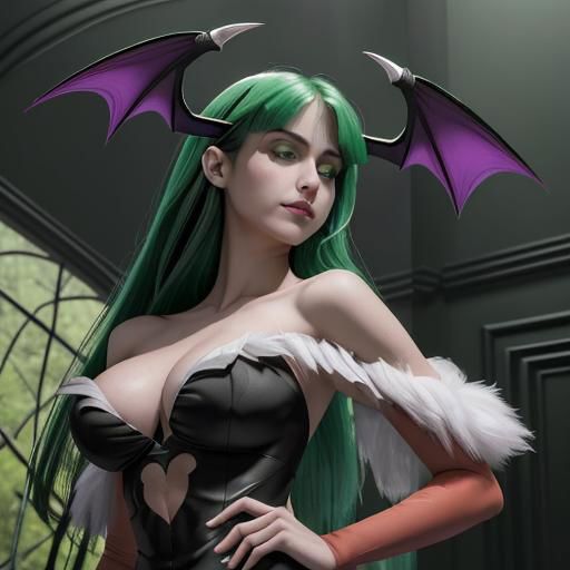 Morrigan Aensland generalmente viste un traje de bao oscuro con adornos verdes. Su atuendo es revelador, mostrando su fsico, y est diseado con un estilo que resalta su aspecto sobrenatural y seductor. El traje de Morrigan consiste en un body de una pieza color oscuro, ajustado al cuerpo, que revela sus piernas, brazos y parte del torso. Tiene detalles verdes que contrastan con el color oscuro del traje. Tambin lleva medias moradas que cubren sus piernas y se extienden hasta sus botas, a menudo de tacn alto y combinadas con accesorios verdes o detalles de encaje. Adems, Morrigan tiene alas oscuras y membranosas que se extienden desde su espalda. Estas alas son un rasgo caracterstico de su diseo y suelen estar presentes en cualquier representacin artstica o ilustracin del personaje. Estas alas complementan su aspecto demonaco y aaden un elemento visual distintivo a su apariencia.