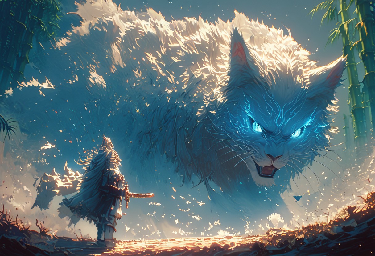 score_9, score_8_up, score_7_up, score_6_up, score_5_up, score_4_up, zPDXL, solo, <lora:MythM4ngaStyle:0.8>, cat wearing bamboo hat, holding katana, ready to fight big monster
