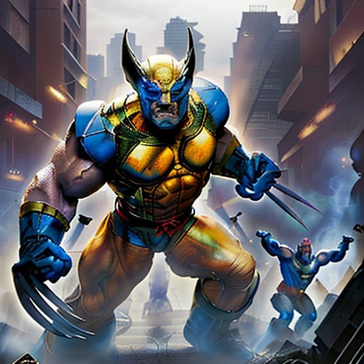 Wolverine fights a giant Sentinel in the streets of New York 2999, score_9, score_8_up, score_7_up, score_7, score_6_up, 1man, wolverine costume, 3 claws, Marvel's Sentinel,