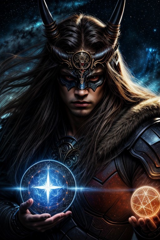 masterpiece, best quality, absurdres, illustration, photorealistic, cinematic, dynamic angle, perfect composition, 1other, oni mask, glowing runes, cosmic energy, starry background, mystical aura, heavenly light, ethereal presence