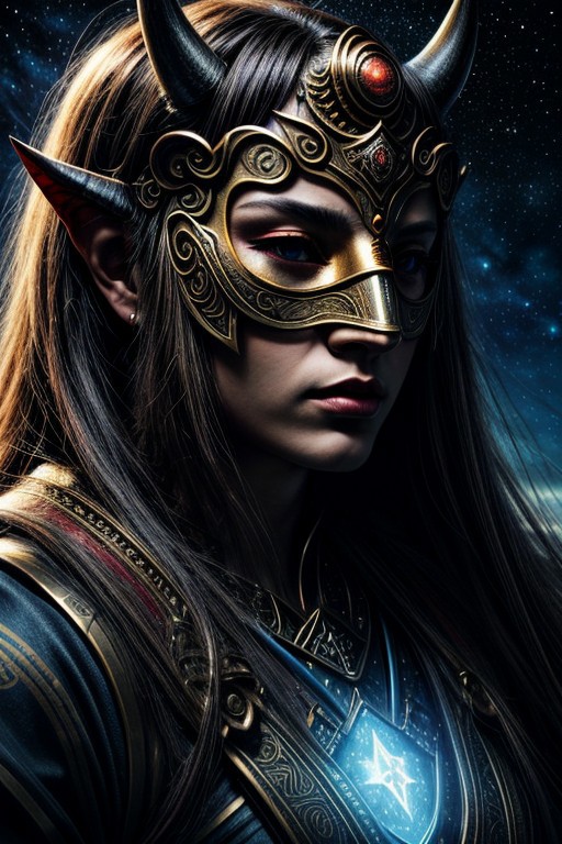masterpiece, best quality, absurdres, illustration, photorealistic, cinematic, dynamic angle, perfect composition, 1other, oni mask, glowing runes, cosmic energy, starry background, mystical aura, heavenly light, ethereal presence