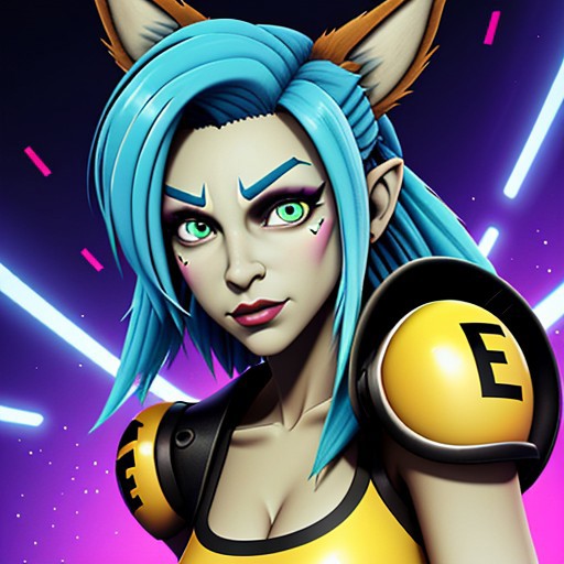 Electra Cortex, fair skin with a slight bluish tint, electric blue hair, styled in a futuristic fashion, eyes glow with a bright yellow hue, indicating her advanced intelligence. The letter “E” is prominently displayed on her forehead in a metallic font, crash bandicoot