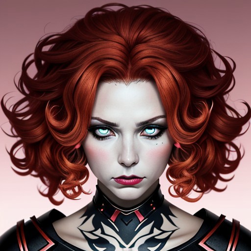 Rebel Cortex, skin is pinkish pale with a slight pinkish tint, contrasting with her vibrant red hair. Her hair is styled in wild curls, framing her face with rebellious energy. Her eyes are a fiery amber, reflecting her fierce determination. The letter “R” is visible on her forehead, etched in bold strokes that symbolize her defiance.