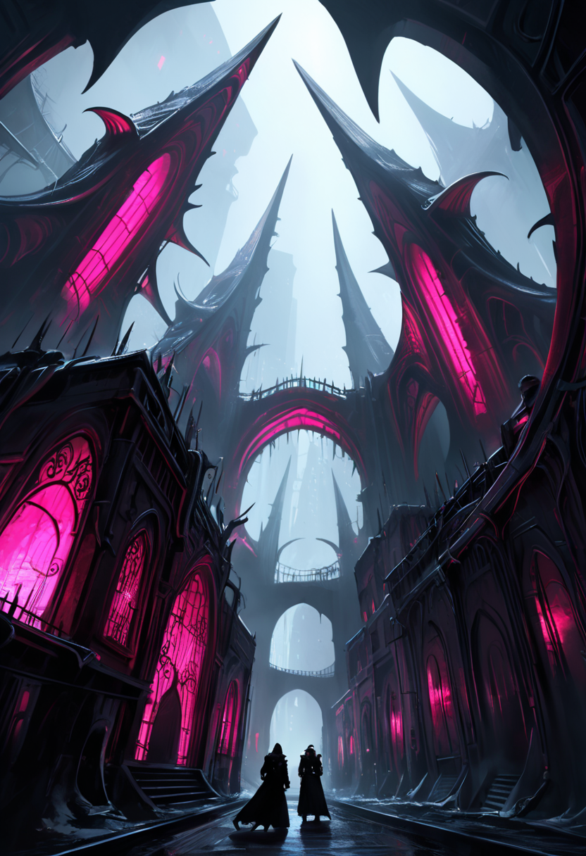 drawix13, Alien city, razor-sharp metallic structures, echoing, echoing corridors, flickering crimson neon lights, stark contrasts, towering gothic structures, unsettling atmosphere, oppressive